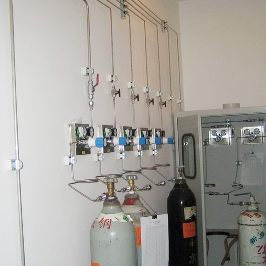 針對腐蝕性、毒性、燃燒性的氣體,通常設計將鋼瓶置于特氣柜(Gas Cabinet)內,再通過管道將氣體供應至現場附近的閥門箱(VMB, Valve Manifold Box),而后再進入制程機臺的使用點(POU, Point of Use),于進入機臺腔體之前,會有獨立的氣體控制盤(GB, Gas Box)與制程控制模塊聯機,以質流流量計控制器(MFC, Mass Flow Controller)進行流量之控制與進氣的混合比例控制,通常此氣體控制盤不屬于廠務系統的設計范疇,而是歸屬制程機臺設備的一部份。一般的惰性氣體則是以開放式的氣瓶架(Gas Rack)與閥門盤(VMP, Valve Manifold Panel)進行供應。